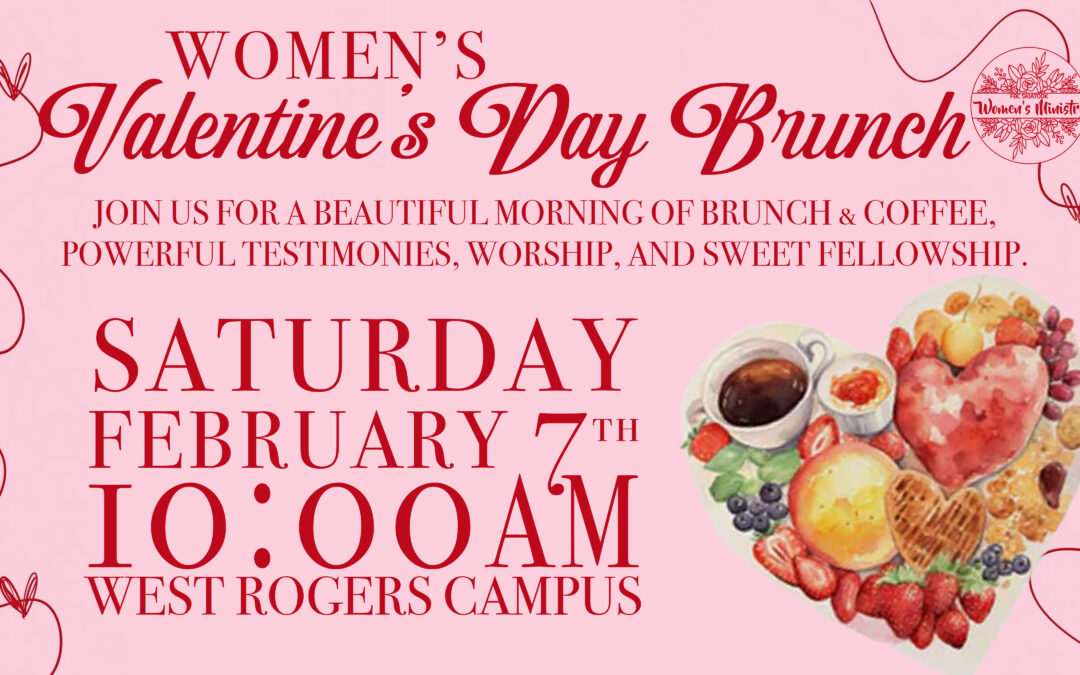 Women’s Valentines Day Brunch Date: February 7, 2026 Add to Calendar Google CalendarMicrosoft OutlookApple CalendarDownload Time: 10:00 AM - 12:00 PM Venue: FBC West Rogers Campus Location: 825 W Rogers Blvd, Skiatook. More info Calendar: FBC Calendar of Events Join us for a beautiful morning of brunch & coffee, powerful testimonies, worship, and sweet fellowship. SATURDAY, FEBRUARY 7 @ 10AM | WEST ROGERS CAMPUS Come be encouraged, refreshed, and reminded you are deeply loved.