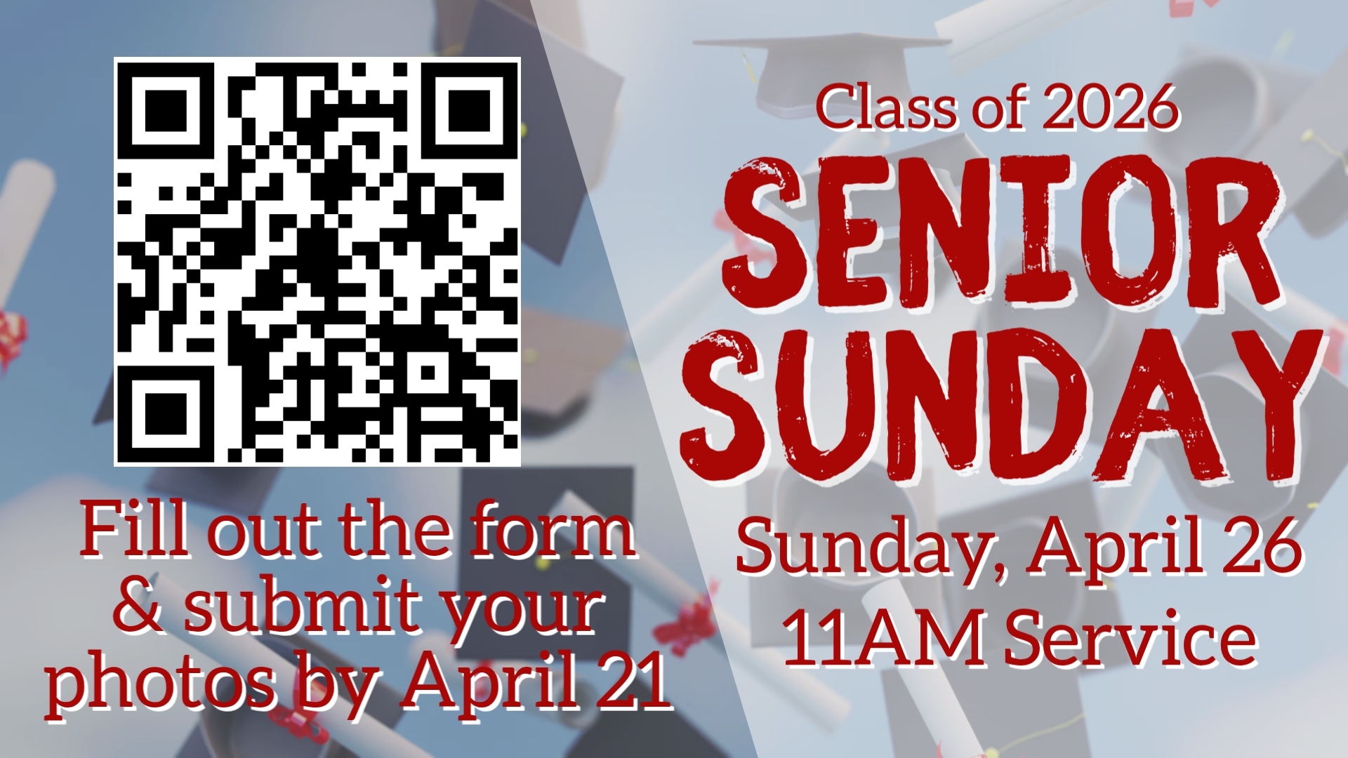 We are excited to celebrate you during our Senior Sunday Program on April 26 at our 11:00 AM service! This is a special time for us to recognize your hard work, achievements, and next steps as you graduate.