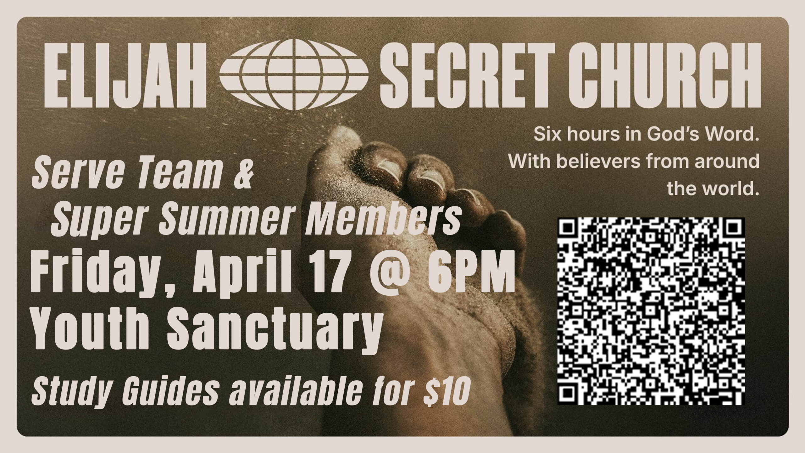 Secret Church is a special event where FBC Students from our Serve Team and Super Summer Members will gather to spend several hours studying the Bible and praying, while also learning about and praying for persecuted Christians around the world.